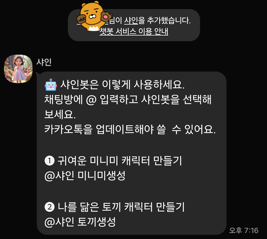 현재 사용할 수 있는 다양한 챗봇들이 있어서 초대를 해서 사용을 하면 된다. 위에 사용법도 소개되어있다.