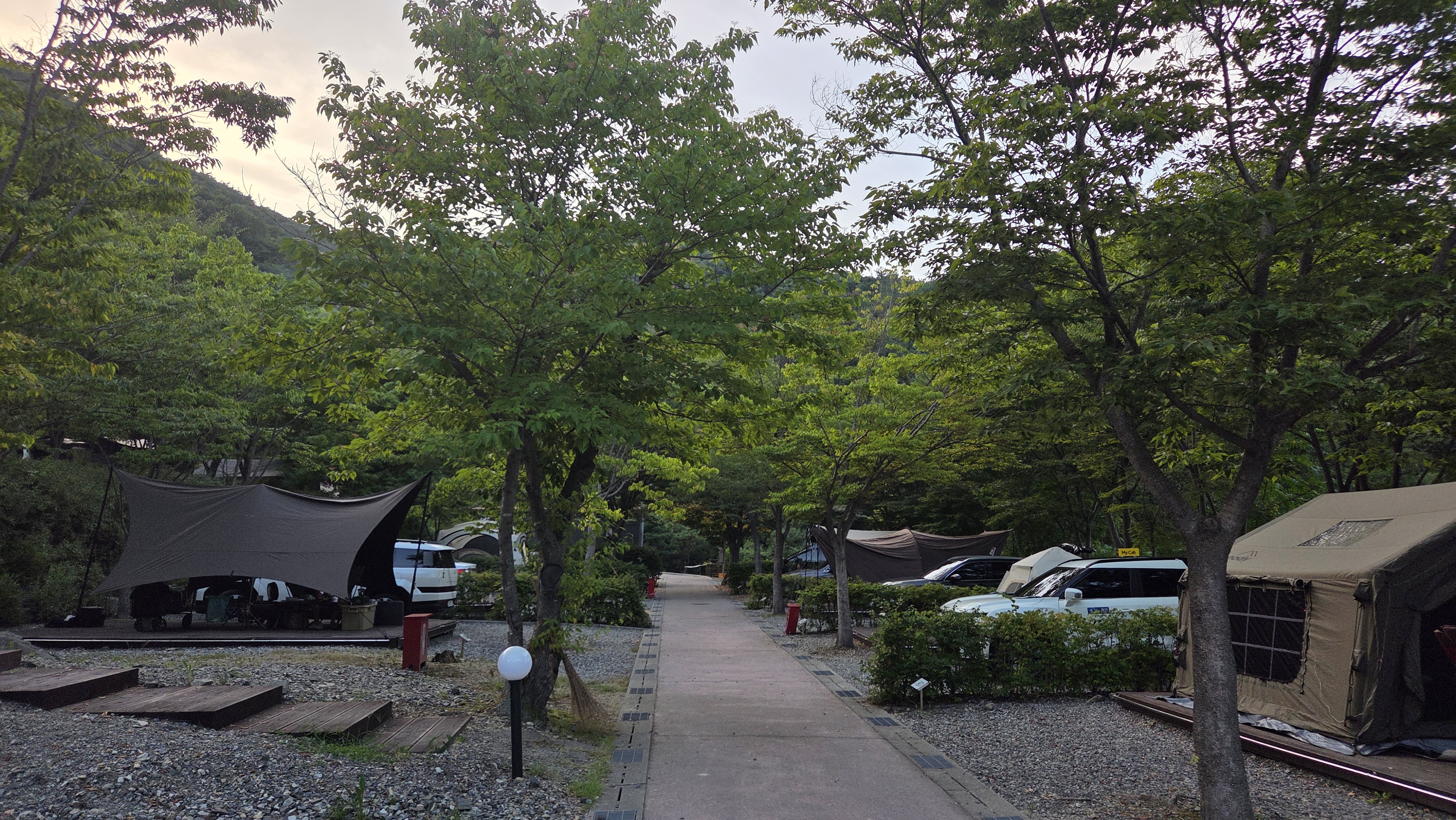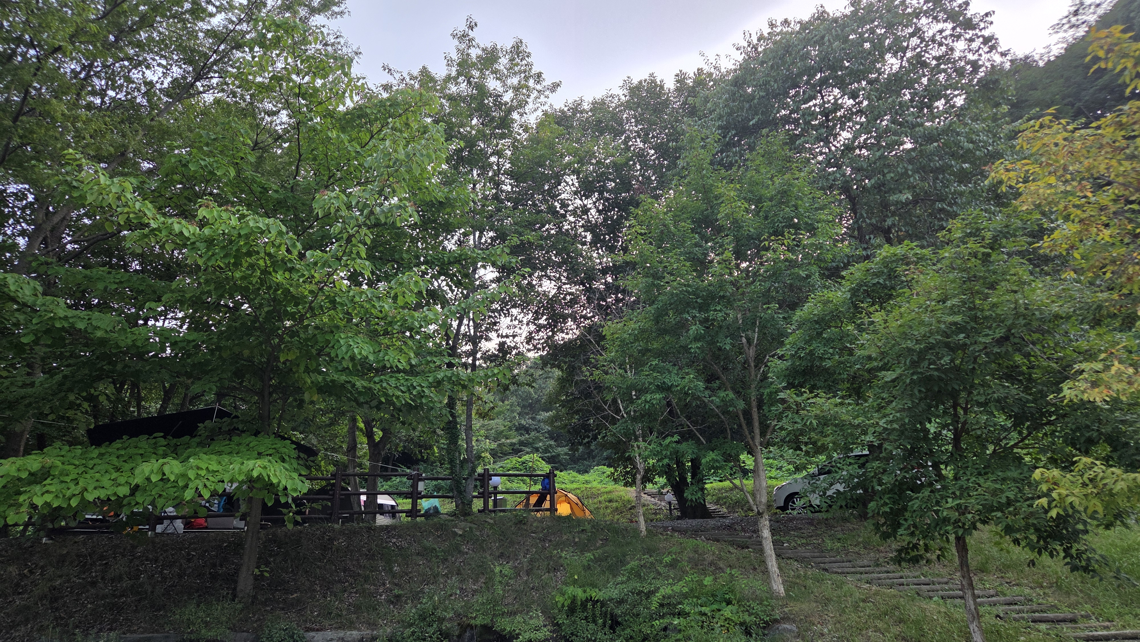 기본적으로 대둔산 수락오토캠핑장은 오토캠핑이 베이스라 사이트 옆 1대 주차가 가능하다. 하지만 내가 예약한 500번대 자리는 주차를 아래에 하고 계단으로 올라가야 하는 사이트이다. 차량들이 텐풍을 가로막는 걸 좋아하지 않아서 일부러 선택했다.