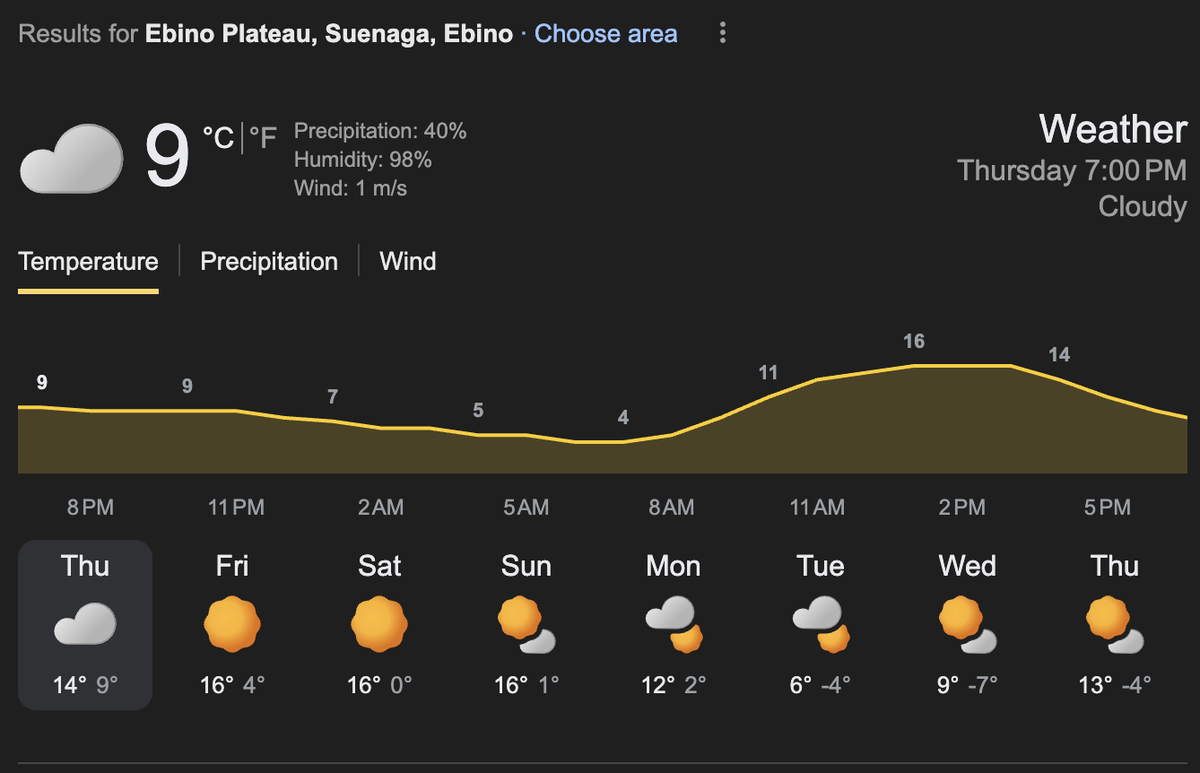 에비노 고원도 날씨는 좋지만 최저기온이 낮은편이다. 핫팩이랑 내복을 잘챙겨야겠다.
