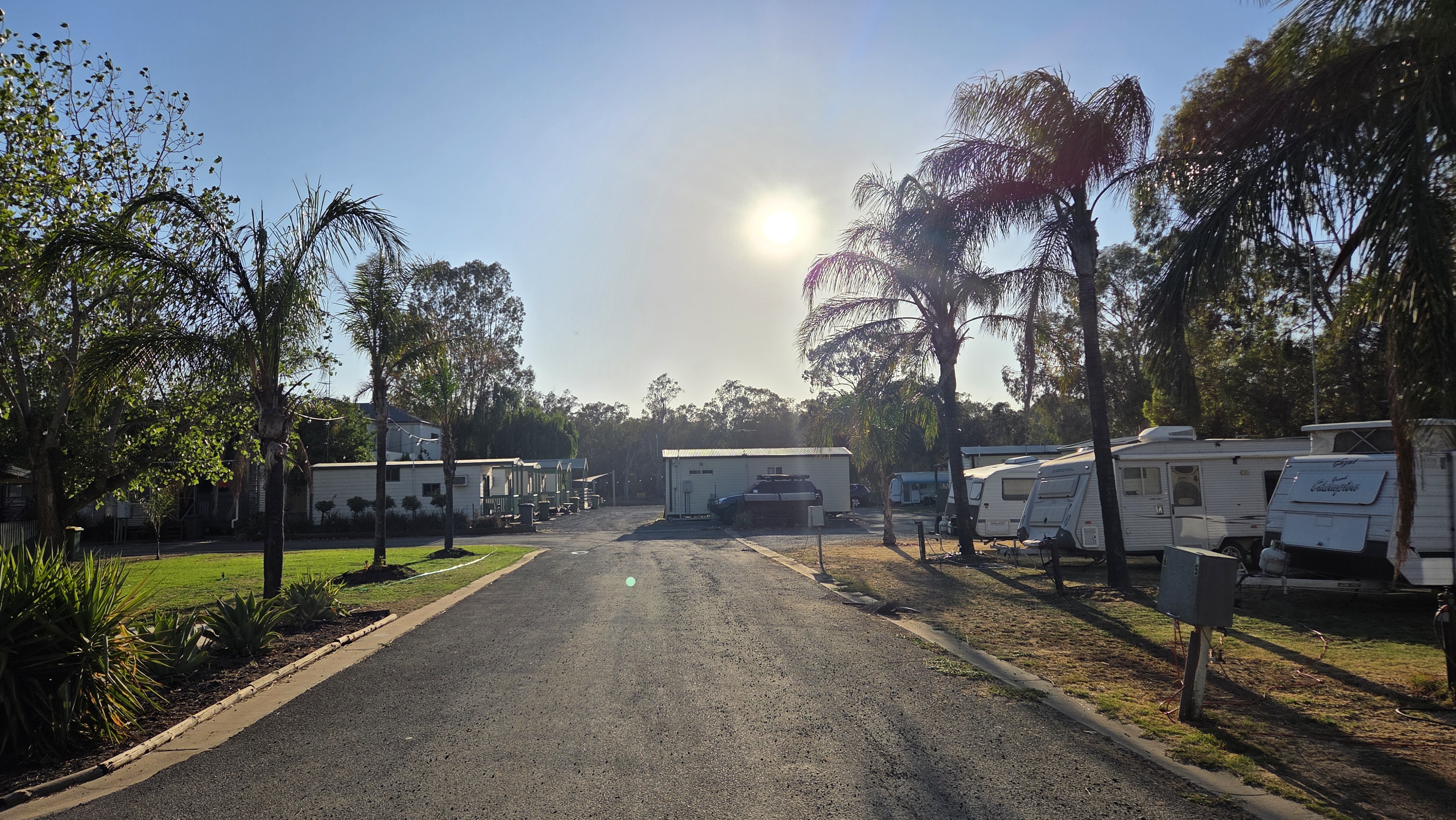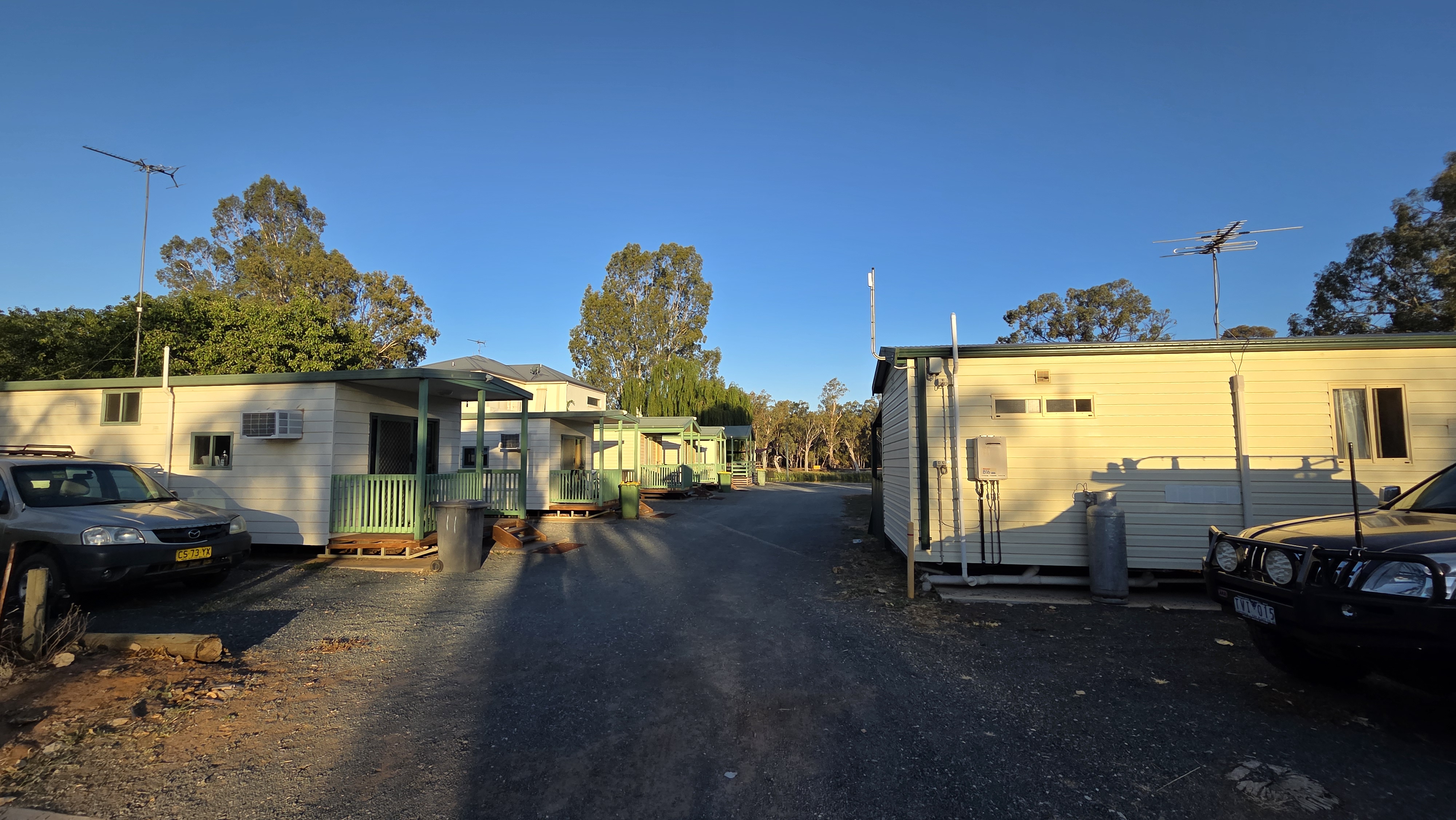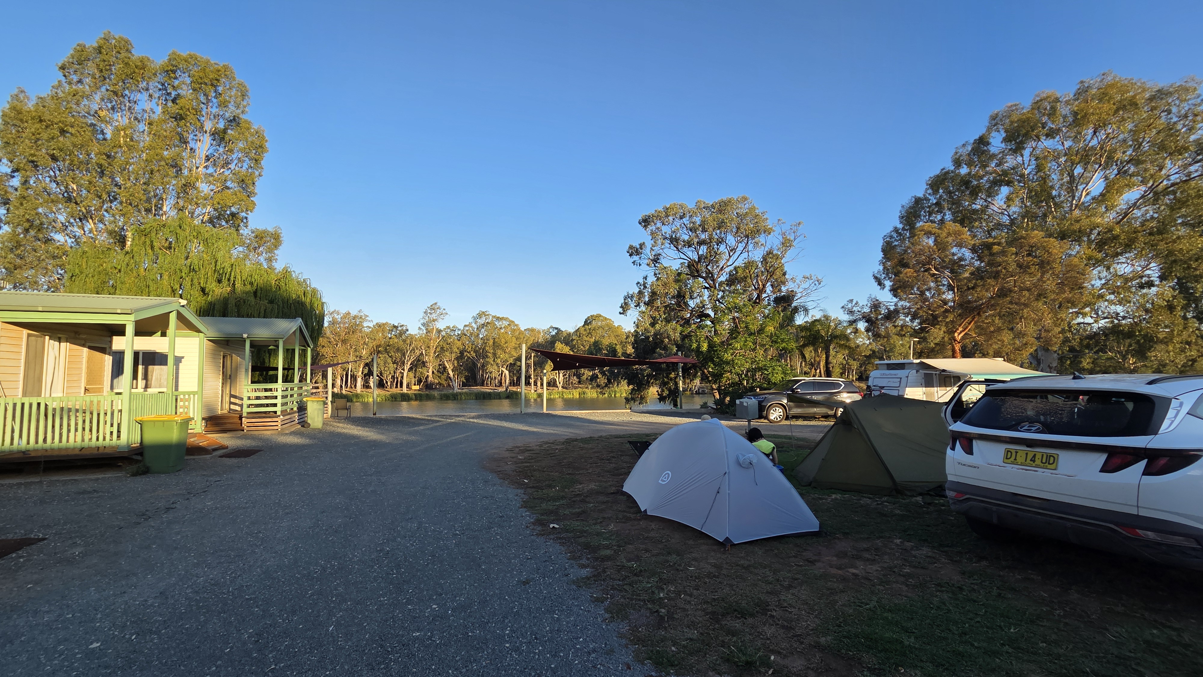 카라반 파크가 머리강(Murray River)을 접하고 있어서 캐빈들 사이로 잔디 사이트가 있었는데 주인분이 거기다 피칭을 하라고 했다. 강물이 맑지는 않았지만 동남아 강변 느낌이 나는 리버뷰였다ㅎㅎ 캐빈 이용객을 제외하면 우리랑 다른 카라반 한 대만이 캠퍼였고 나머지는 캐빈의 장기 거주자들인 것 같았다.