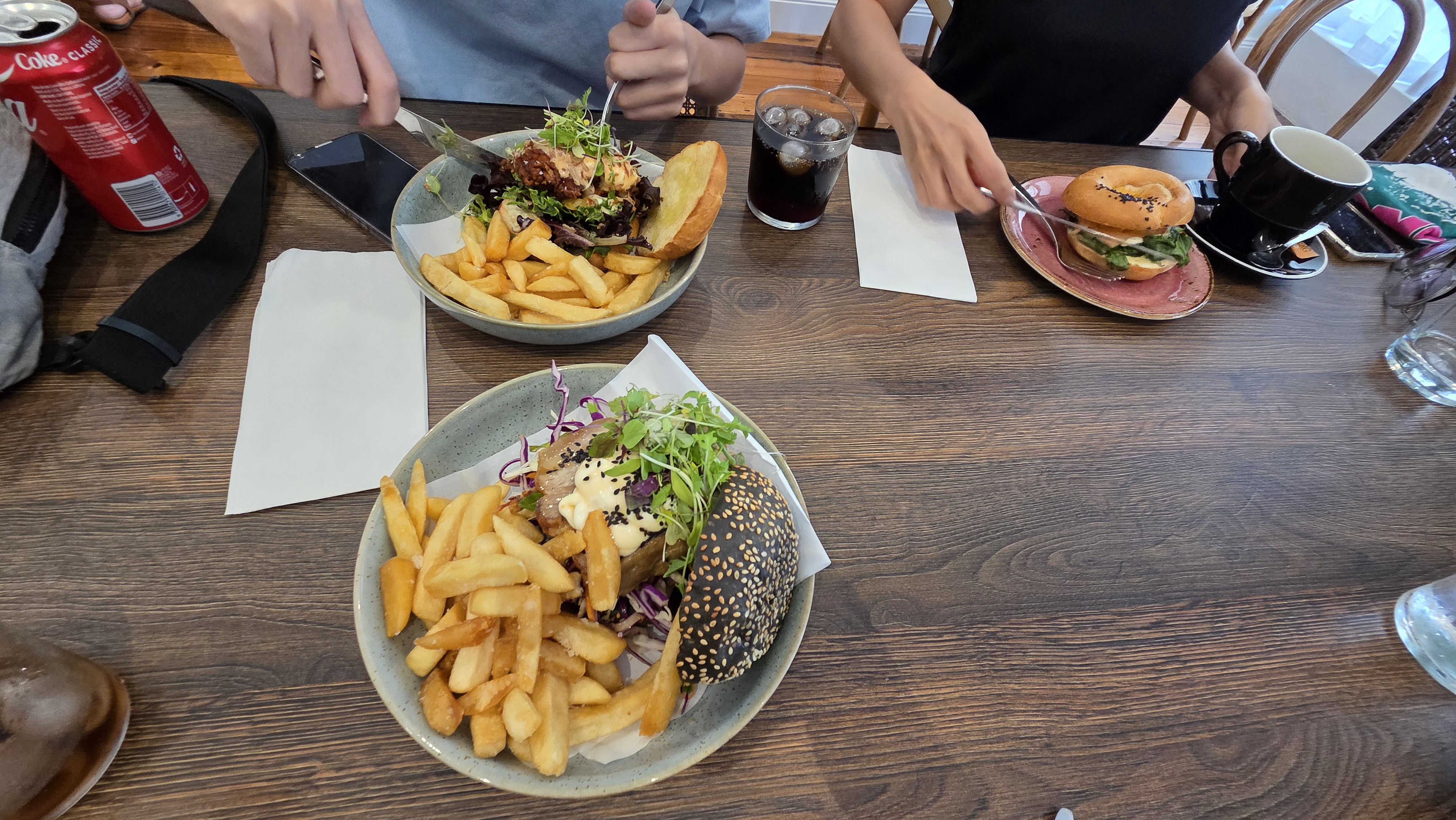 포크롤과 치킨롤을 주문하고, 베이글을 구입했다. 포크롤과 치킨롤은 각 24달러(한화 24,000원), 26달러(한화 26,000원) 였는데 정말 양이 많긴 했다. 롤이라고 했는데 수제버거처럼 제공되었다. 가격은 비쌌지만 맞은 있었다. 연어 베이글은 10달러(한화 10,000)원 커피는 7달러 콜라는 3달러 정도로 기억한다. 호주에서 요리라는 기술이 들어가면 1인당 3만원은 드는 것 같다.
