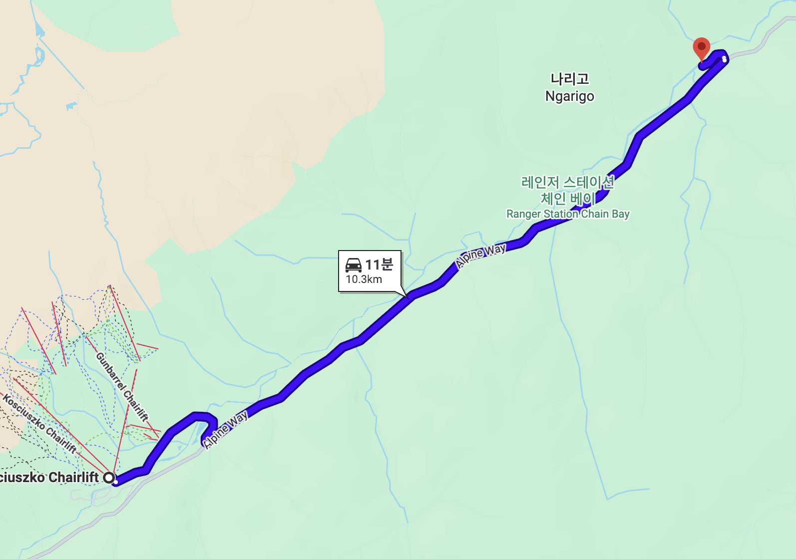 코지어스코 체어리프트로부터 약 10분이면 도착 가능하다.