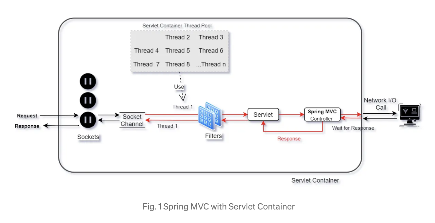 Spring MVC스프링 MVC의 기본동작은 ThreadPerRequest이다. Sync/Blocking1 Request -> 1 Thread많은 수의 Thread Pool을 사용한다.스레드 수가 너무 많으면 컨텍스트 스위칭에 대한 비용이 증가스레드 수가 너무 적으면 스레드 고갈로 인한 지연이 발생하는 문제점을 가지고 있다.처리 순서는 다음과 같다.일단 요청이 들어오면 스레드를 하나 할당 받는다.요청은 Filter -> DispatcherServlet -> Controller로 전달되고, 해당 스레드는 IO작업이 발생하더라도 블락킹된다.Spring WebFlux스프링 WebFlux의 동작 방식은 EventLoop이다. Async/Non-BlockingN Request -> 1 ThreadN: M 이지만 ..